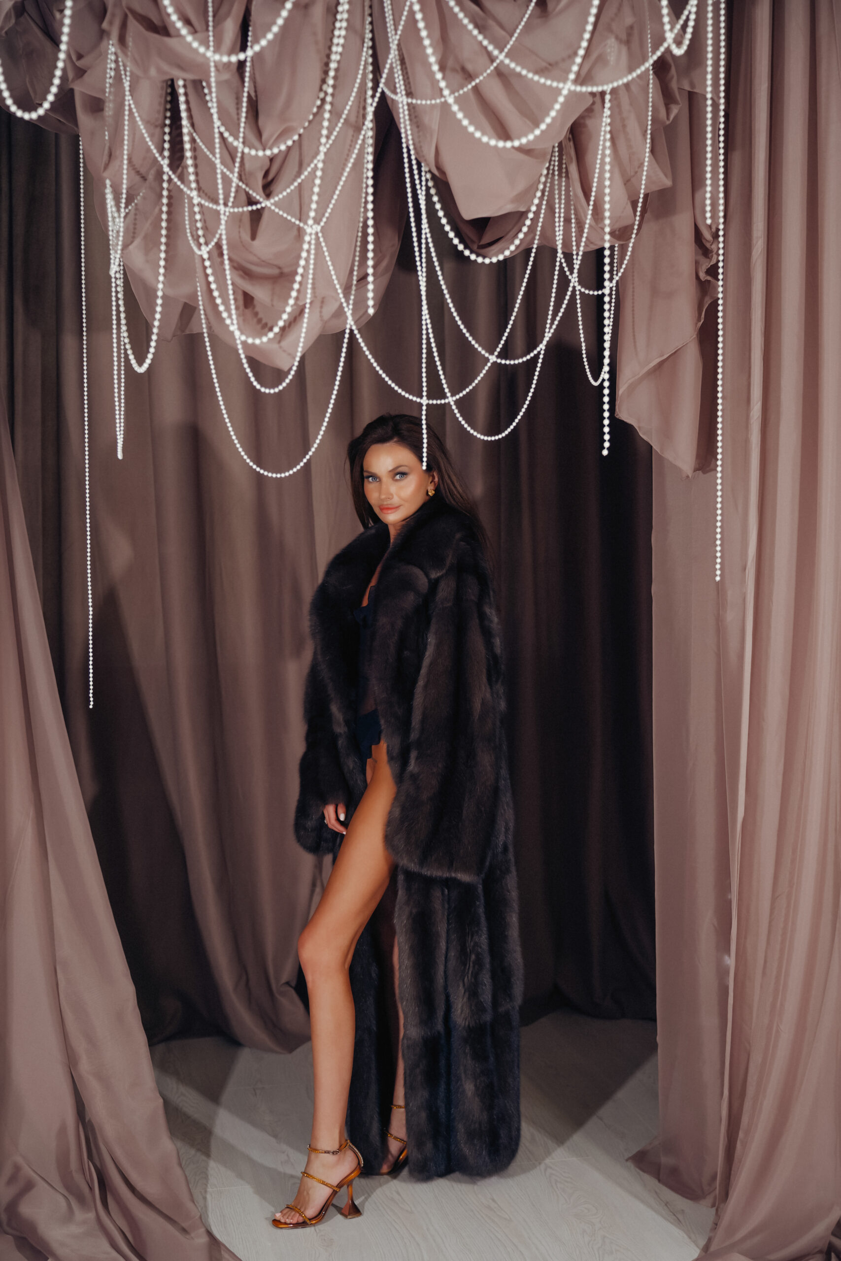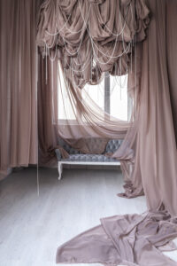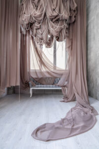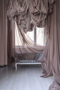 Стеля висотою 4,5 м з підвісними тканинами створює ефектність і додає динаміки знімкам. Ідеальне місце для fashion-проєктів, креативних портретів і зйомок з характером.